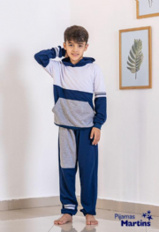 com mangas e touca no azul marinho e bolso na cor cinza. Calça com elástico no